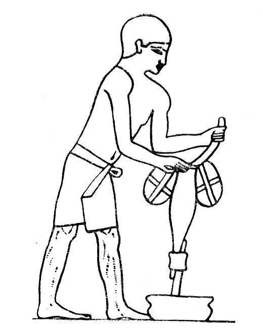 Для приведения в действие сверл-полумесяцев у египтян было специальное приспособление. Оно состояло из длинного деревянного стержня, верхняя часть которого имела изогнутую рукоятку. Под рукояткой к стержню прикреплены два тяжелых камня, игравших роль груза, необходимого при сверлении. Нижний конец стержня оканчивался развилкой.
