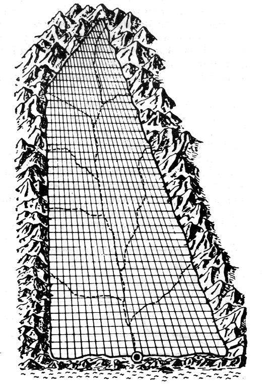 После описания столицы (см. рис. 3) следует описание всего острова. Город находился на краю суши, имевшей форму прямоугольника длиной 3000 стадиев и шириной 2000 стадиев, то есть занимал площадь 579x386 км. Равнина эта со всех сторон была окружена горами, но ни высота, ни площадь горной гряды не указываются. Платон только упоминает, что остров своими размерами превышал Ливию (Африку) и Азию (Малую Азию), вместе взятые. И хотя Платону не была известна действительная площадь Африки и Малой Азии, он допустил явное преувеличение, так как даже известная в его время часть Африки была значительно больше.