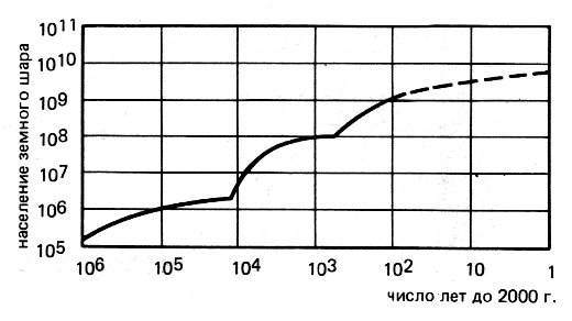 Рис. 5. График, показывающий гипотетическое увеличение населения земного шара в течение последнего миллиона лет. В период предполагаемого существования Атлантиды на Земле жило чуть больше 1 миллиона человек. (По Э. Дивею, 1960)