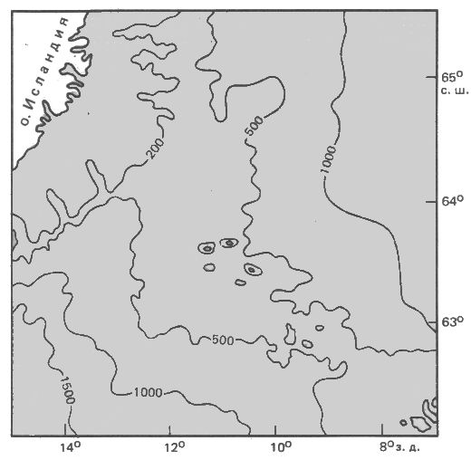Рис. 17. Морфология Фарерско-Исландского порога. Отдельные его части достигают уровня моря и, как считают некоторые авторы, погрузились под воду совсем недавно. (По данным Н.Ф. Жирова, 1964)