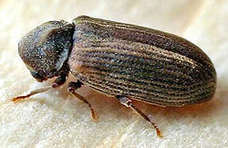 Среди 11 видов рода Anobium, обитающих в России и сопредельных странах, есть еще один точильщик. Он не менее известен и причиняет человеку не меньший ущерб, чем описанный выше. Это домовый точильщик (Anobium pertinax). Этого жука мебель не интересует: он специализируется главным образом на хвойной древесине в постройках в местах периодических увлажнений. Излюбленное местожительство его – срубы деревенских бань.