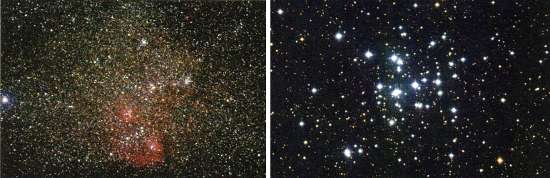 В созвездии Возничего можно наблюдать рассеянные скопления М36 и М38 (слева) и М37 (справа)