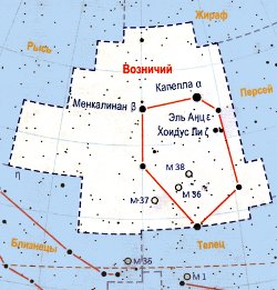 Возничий — созвездие северного полушария, находящееся в околополярной области неба. Самая яркая звезда — желтая двойная Капелла (α Возничего, 0,1m), в переводе с латинского означает «козочка», или «козья звезда». Капелла — шестая по яркости звезда на небе, ее светимость больше солнечной в 170 раз, расстояние до этого гиганта 13 парсек. Звезда представляет собой систему из шести звезд, которые к сожалению нельзя увидеть раздельно даже в хороший бинокль.