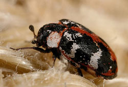 Одним из наиболее распространенных и сильно вредящих представителей семейства является кожеед норичниковый (или коричневый).