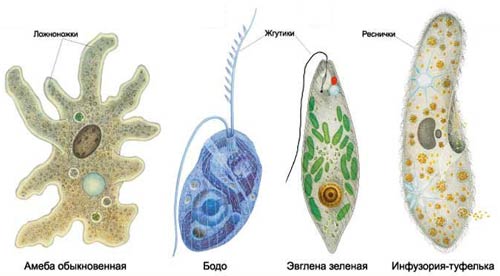 В отличие от клеток многоклеточного организма у одноклеточных есть органоиды специального назначения. Это органоиды движения – ложноножки – псевдоподии; жгутики, реснички. Имеются и органоиды осморегуляции – сократительные вакуоли. Есть специализированные органоиды, обеспечивающие раздражимость.