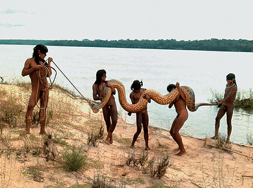 Гигантская анаконда, или большой водный удав, обычно бывает не длиннее 5 метров, но может достигать 11 метров, соперничая в этом с самыми крупными питонами. Желтая анаконда намного меньше. Темно-зеленая с пятнами, гигантская анаконда живет по берегам тропических рек к востоку от Анд и в Тринидаде. Она охотится ночью, подстерегая добычу в воде. Зубами она захватывает жертву и, обвившись вокруг нее, душит, или чаще топит ее в воде. Жертв анаконды выбирают размером с поросенка или каймана. Крупные кайманы, впрочем, и сами не прочь полакомиться мясом анаконды, так же, как и ягуары, часто устраивающие охоту на водных удавов. Нередко раненая в подобных схватках анаконда становится добычей пираний. Но избегнув неприятных встреч, анаконда может дожить до 75 лет.