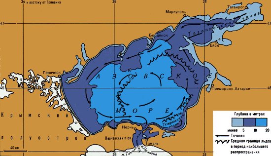 На Азовском море ежегодно образуются льды, причем ледовитость (площадь, занятая льдом) сильно зависит от характера зимы (суровая, умеренная, мягкая). В умеренные зимы к началу декабря лед образуется в Таганрогском заливе. В течение декабря припай устанавливается вдоль северного берега моря, а несколько позже — у остальных берегов. Ширина полосы припая — от 1,5 км на юге до 6 — 7 км на севере. В центральной части моря лишь в конце января — начале февраля появляется плавучий лед, который затем смерзается в ледяные поля большой сплоченности (9—10 баллов). Наибольшего развития ледяной покров достигает в первой половине февраля, когда его толщина 30—40 см, в Таганрогском заливе — 60—80 см.