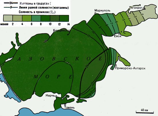В 60 — 70-х гг. в бассейне Азовского моря возросли изъятия пресных вод для хозяйственных целей, что обусловило сокращение речного стока в море и соответственно увеличение поступления черноморских вод. Это совпало с периодом пониженной увлажненности в водосборном бассейне моря, и под влиянием всех факторов с 1967 г. началось увеличение солености. В 1976 г. средняя соленость в море достигла максимальной величины — 13,7‰. В Таганрогском заливе она возросла до 7—10‰ на выходе из залива — до 12‰. Стала ощутимее пространственная неравномерность солености, в прикерченском районе, особенно в маловодные годы, ее значения повышались до 15—18‰, т.е. до величин, никогда не наблюдавшихся в море с начала столетия.