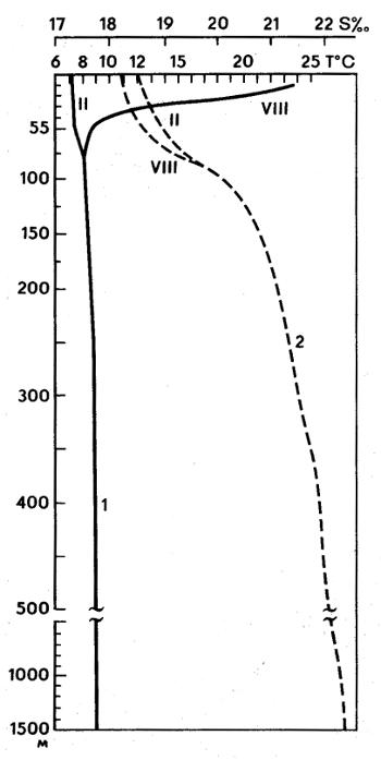 Начиная с горизонтов 150—200 м, соленость и температура медленно повышаются к дну из-за влияния поступающих в глубинные слои более соленых и теплых мраморноморских вод. На выходе из Босфора они имеют соленость 28—34‰ и температуру 13—15°, но быстро изменяют свои характеристики, перемешиваясь с черноморской водой. В придонном слое небольшое повышение температуры происходит и благодаря геотермическому притоку тепла от дна моря. Глубинные воды, располагающиеся в слое от 1000 м до дна и занимающие в Черном море зимой (II) и летом (VIII) более 40% объема моря, отличаются большим постоянством температуры (8,5—9,2°) и солености (22—22,4‰.