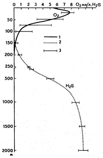 Вертикальное распределение кислорода и сероводорода в Черном море. 1 — среднее содержание кислорода, 2 — среднее содержание сероводорода, 3 — отклонение от среднего