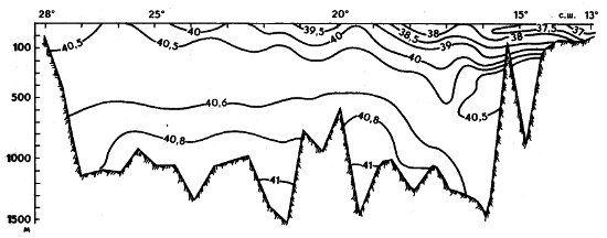 Глубинная вода распространяется в южном направлении и прослеживается по минимуму температуры (21,6—21,7°) в слое 500—800 м. Летом минимум температуры выделяется почти вдоль всего моря. В придонном слое отмечается небольшое повышение температуры и солености, предположительно связанное с влиянием горячих рассолов, заполняющих глубоководные впадины. Вопрос о взаимодействии рассолов с водами моря изучен пока недостаточно.
