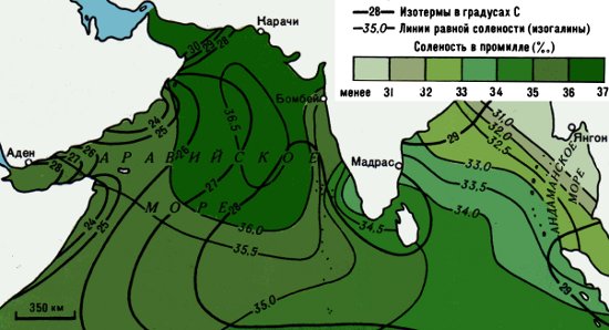 Температура воды и соленость на поверхности Аравийского и Андаманского морей летом