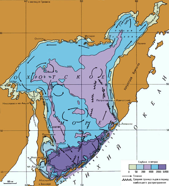 Однако даже глубина самого глубокого из Курильских проливов значительно меньше максимальной глубины моря, и поэтому Курильская гряда представляет собой огромный порог, отгораживающий впадину моря от океана.