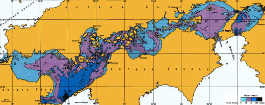 Зимой (февраль) она несколько повышена и имеет значения на поверхности, равные 32,5—34‰. Наибольшие величины солености (33,5—34‰) наблюдаются в западной части моря и в проливе Кии, что связано с поступлением относительно высокосоленых вод из Тихого океана. В центральной части моря соленость несколько понижена (32,5—33‰). Более высокая соленость (около 33‰) отмечается у северных берегов моря. На северо-востоке она снова слегка уменьшается. С глубиной соленость немного увеличивается между горизонтами 25 и 40 м, откуда она очень мало изменяется до дна.