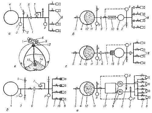 Схемы двигательных установок с газовыми ракетными двигателями: а — двигательная установка с пневматическими ракетными двигателями; б — двигательная установка с ракетными двигателями на испарённом рабочем теле; в — двигательная установка с сублимационными ракетными двигателями; г — двигательная установка с ракетными двигателями на продуктах каталитического разложения жидкостного монотоплива; д — двигательная установка с ракетными двигателями на продуктах каталитического разложения газообразного монотоплива; е — двигательная установка с ракетными двигателями на продуктах электролиза воды; 1 — управляющий клапан; 2 — дренажно-предохранительный клапан; 3 — датчик (реле) давления; 4 — сжатый газ; 5 — заправочный клапан; 6 — фильтр; 7 — редуктор давления; 8 — реактивные сопла (камеры); 9 — ресивер газа (пара); 10 — испаритель-подогреватель; 11 — жидкое топливо (рабочее тело); 12 — разделительная диафрагма; 13 — терморегулируемый дроссель; 14 — сублимирующее твёрдое вещество; 15 — термочувствительный элемент; 16 — катализатор; 17 — электролитическая установка