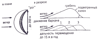 Бархан – материковая дюна пустынь. Скопление сыпучего песка, навеянного ветром и незакрепленного растительностью, серповидное в плане. Наветренный (выпуклый в плане) склон дюны длинный и пологий, подветренный (вогнутый) – короткий и крутой, переходящий в пару направленных по ветру понижающихся и заостренных рогов». Дюна движется вдоль направления действия ветра путем перемещения (пересыпания) частиц с наветренного на подветренный склон.