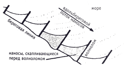 Волнолом – стенка, построенная под таким углом к пляжу, чтобы перехватить вдольбереговой поток наносов.