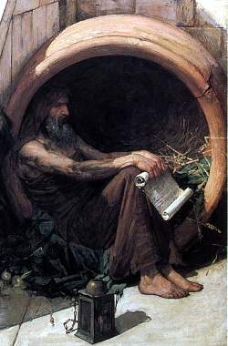 Диоген Синопский (около 412 до н.э. — 323 до н.э.) — древнегреческий философ из школы киников. Родился в Синопе, после изгнания из родного города за фальшивомонетничество, отправился к дельфийскому оракулу, который посоветовал ему «сделать переоценку ценностей». Жил в г. Крания близ Коринфа. Он учил, что люди станут свободными и счастливыми только тогда, когда сумеют сократить свои потребности настолько, чтобы не зависеть от общества и государства. Отказавшись от богатства, он жил в большой глиняной бочке на рыночной площади города, одевался в рваный плащ и стоптанные сандалии, питался отбросами, которые подбирал на рынке. Философ счел себя совершенно независимым от городских властей и от общества, благами которого он не желал пользоваться. Некоторые считали его мудрецом, другие возмущались его поведением, называя его «собачьим». При встрече с Александром Македонским, предложившим ему исполнить любое его желание, он попросил его не заслонять ему солнца. Однако царь сумел найти выход из глупого положения, в которое он попал. Вместо того чтобы наказать дерзкого мудреца и создать ему славу мученика, Александр улыбнулся и сказал: «Если бы я не был Александром, я хотел бы быть Диогеном».